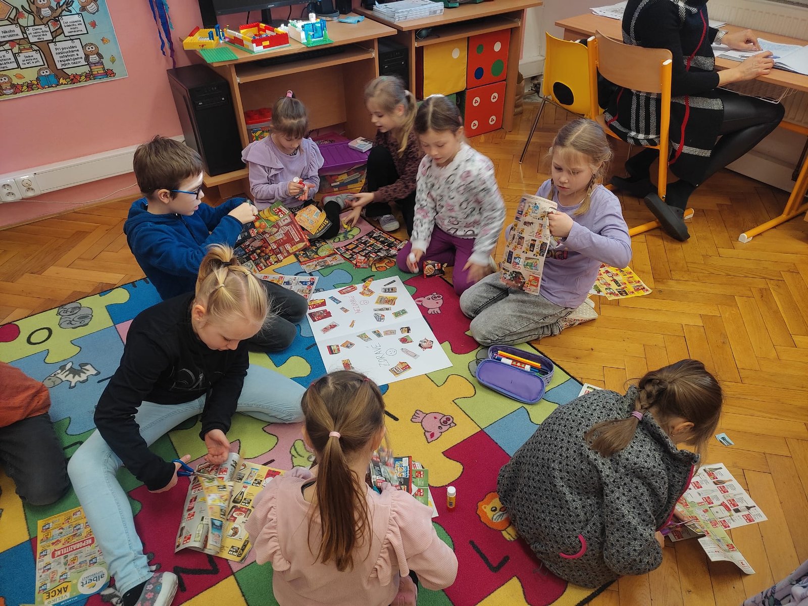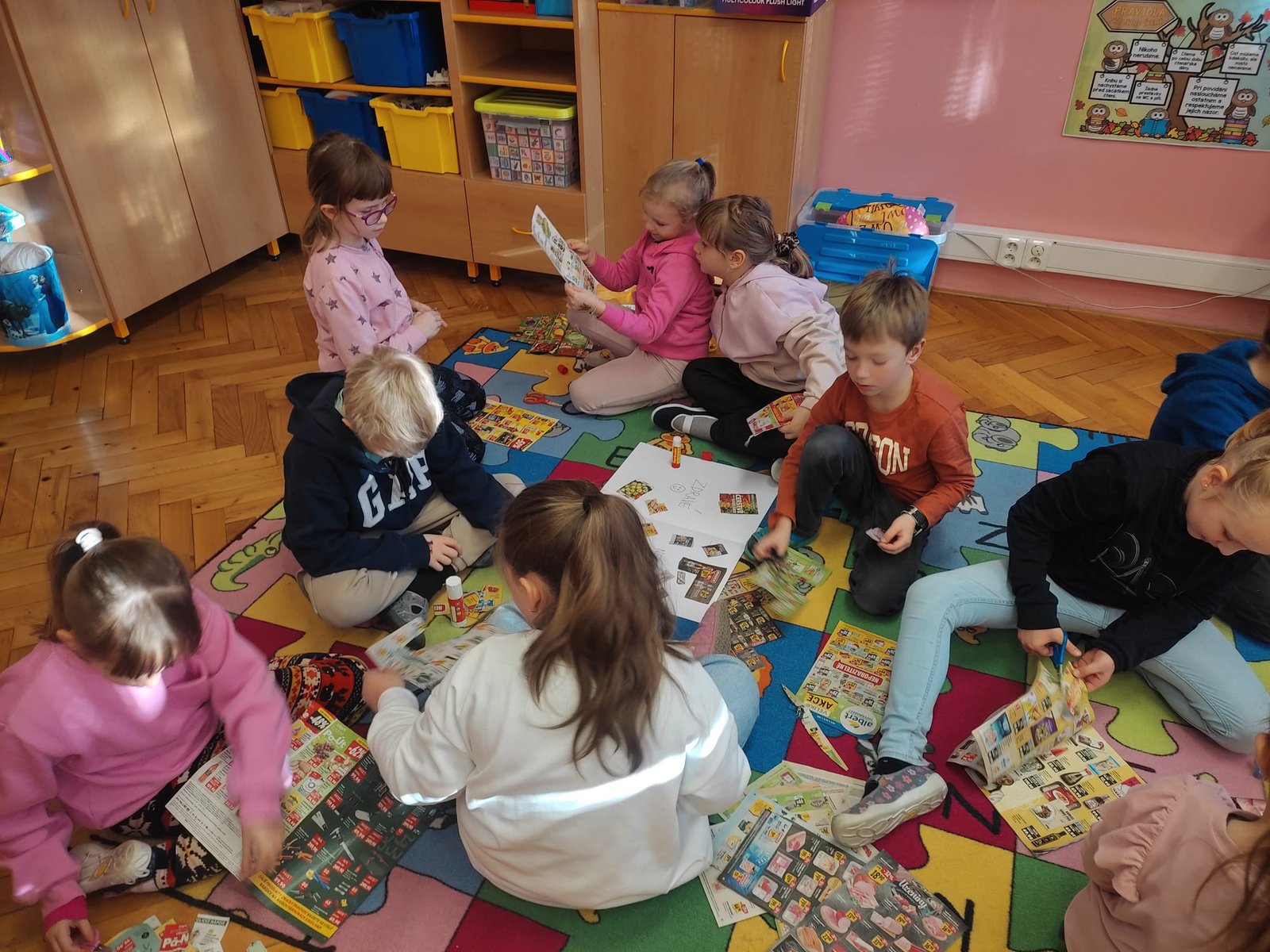 Děti pracovaly s letáky z obchodů, ze kterých vystřihovaly obrázky různých potravin. Ty následně třídily do dvou skupin – zdravé a nezdravé. Společně jsme si pak jednotlivé potraviny prohlíželi, pojmenovávali a vysvětlovali si, proč patří právě do dané skupiny.