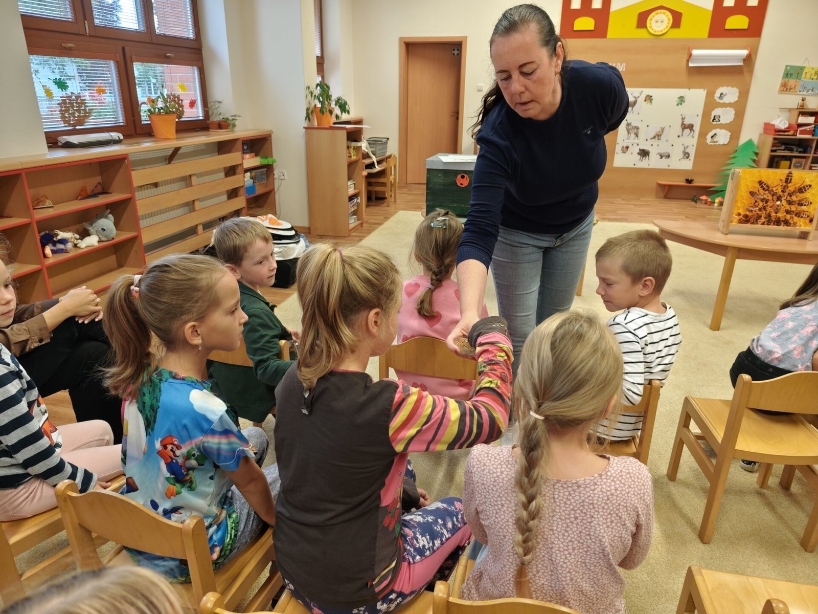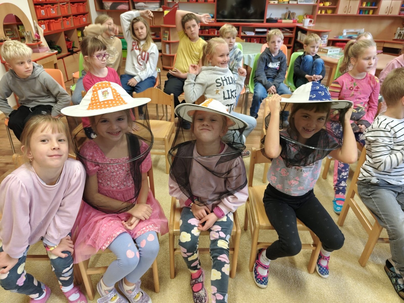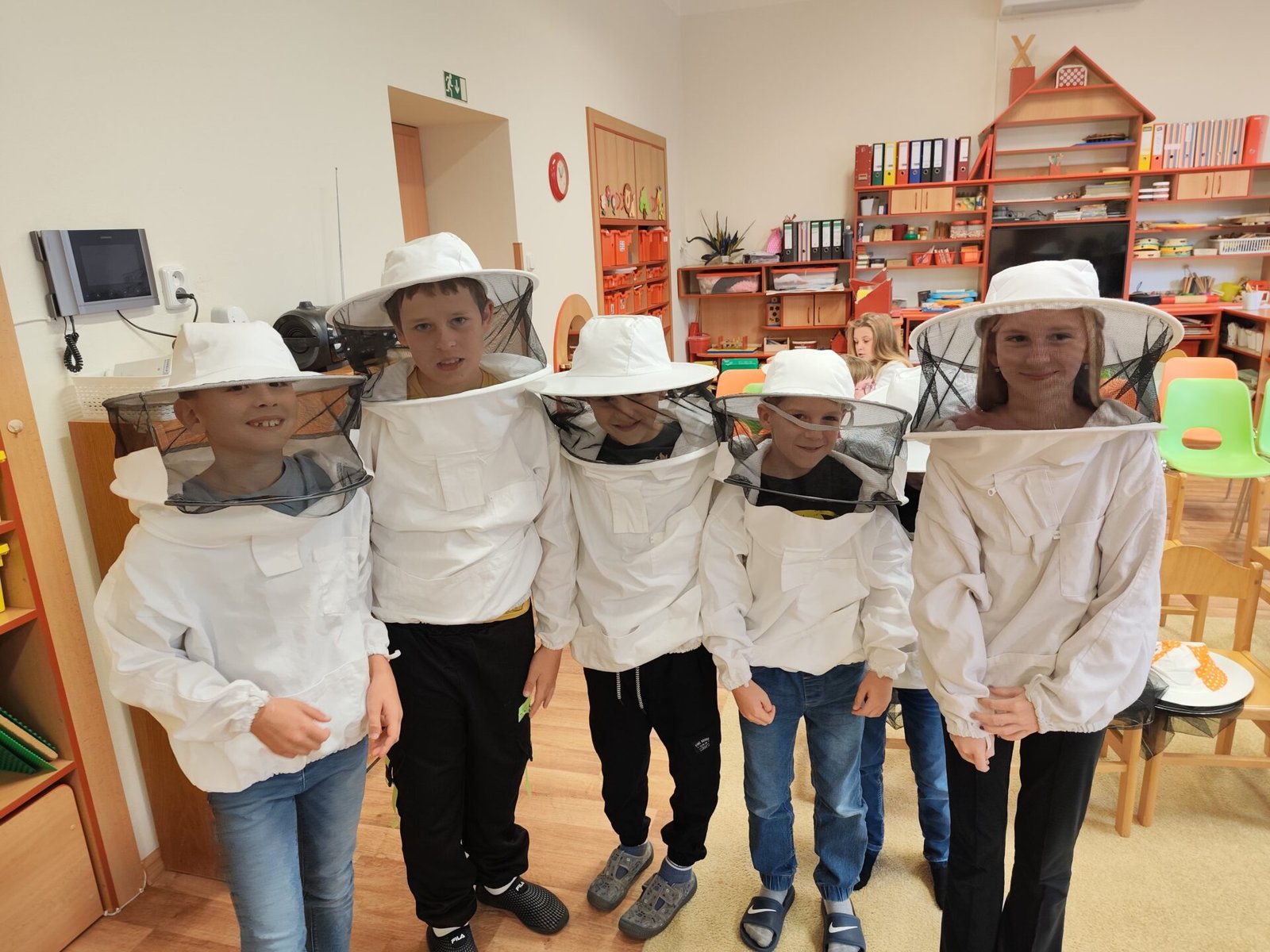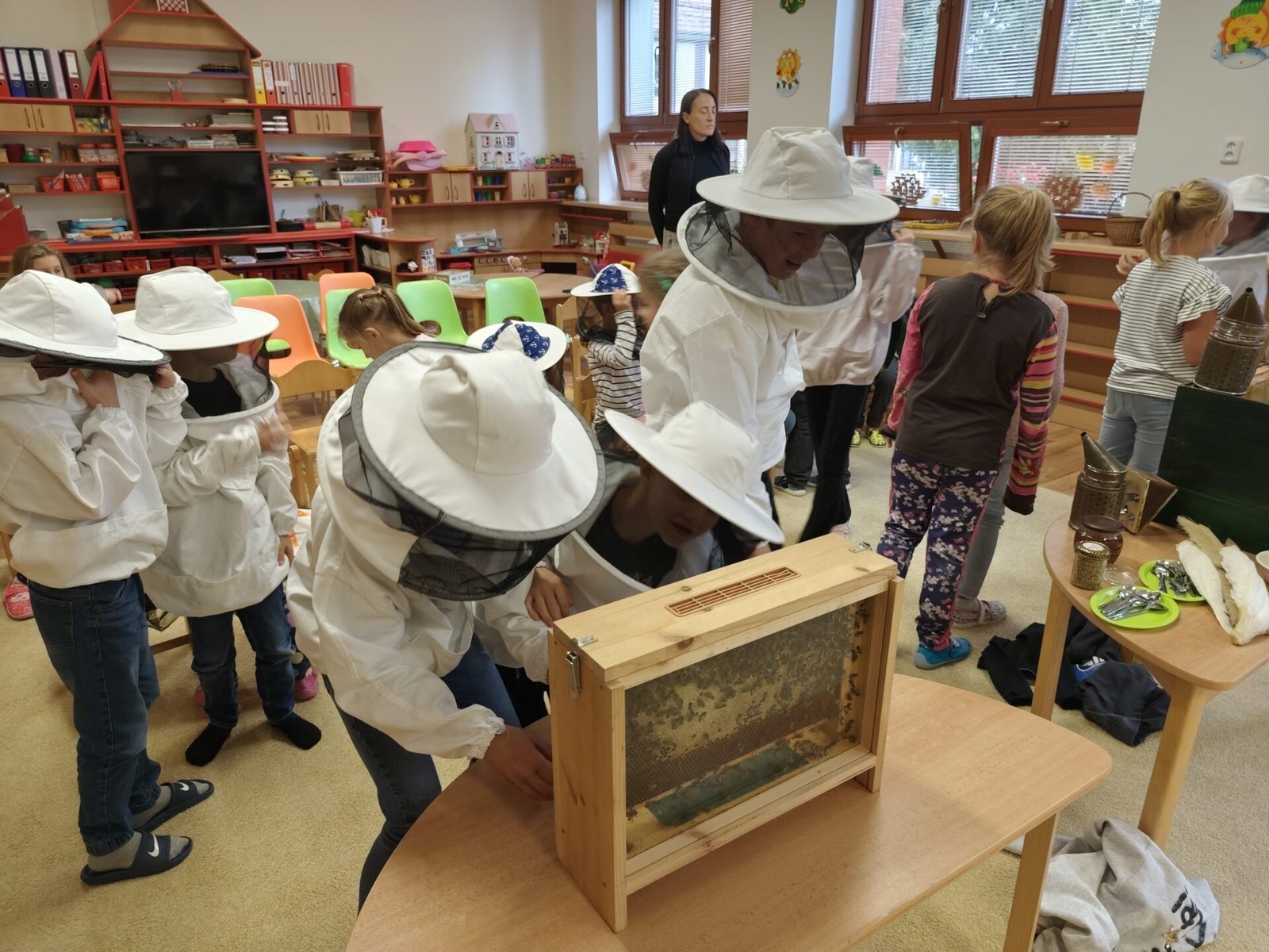 Naši školu a školku navštívila paní včelařka, která nám připravila velmi zajímavou přednášku o životě včel. Přivezla si s sebou ukázku včelařského oblečení a pomůcek, které při své práci používá. Mohli jsme si je prohlédnout zblízka a dozvěděli jsme se, k čemu přesně slouží.