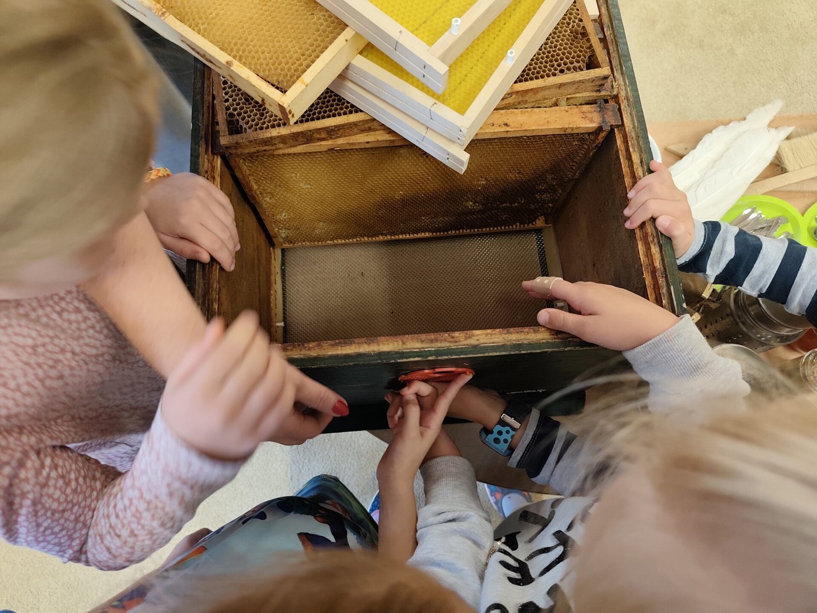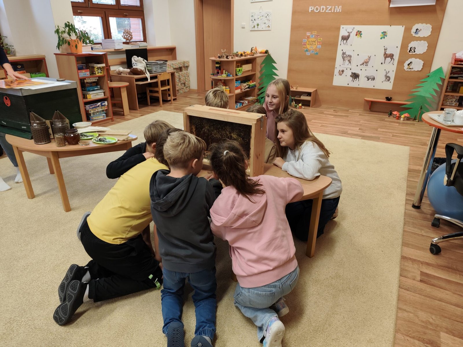 Velkým zážitkem bylo, že jsme viděli živé včely v uzavřeném proskleném úlu. Díky tomu jsme pozorovali jejich čilý pohyb a práci přímo na plástvi. Paní včelařka nám vysvětlila, jak se včely dělí na dělnice, trubce a matku, a co je úkolem každé z nich.